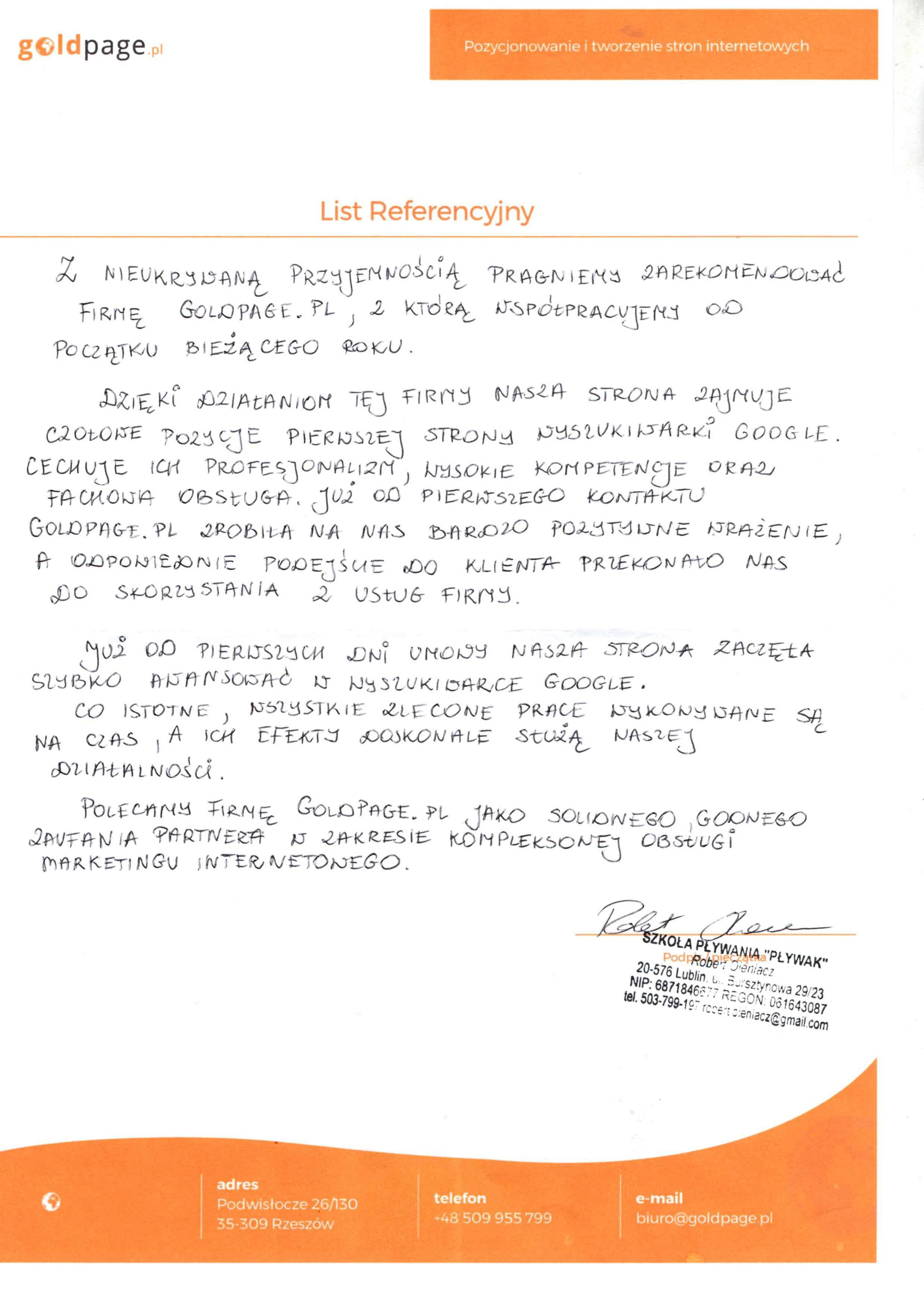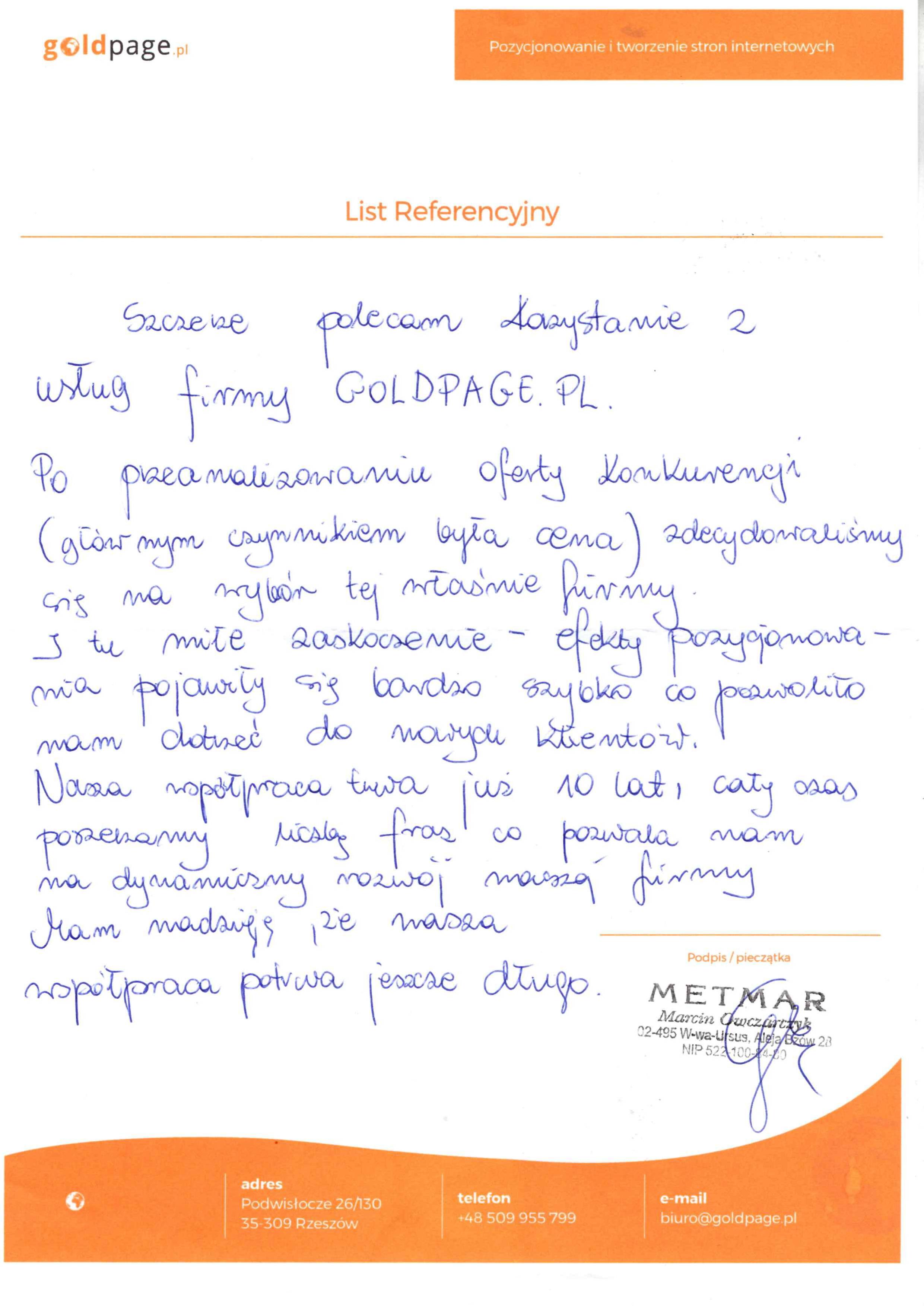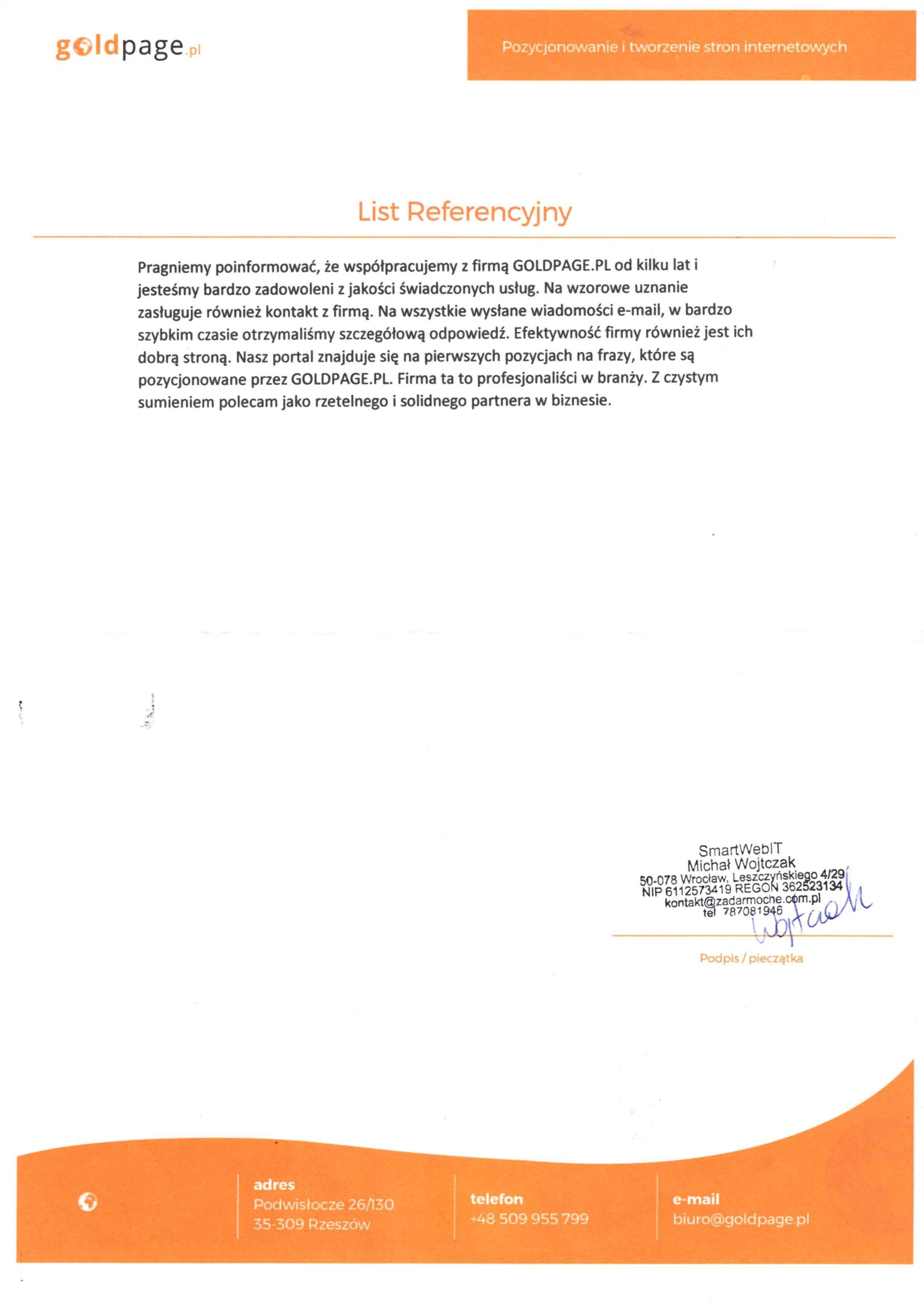 Firma Goldpage.pl powstała w 2009 roku i mimo upływającego czasu i licznych zmian w algorytmie Google, ciągle z sukcesem pozycjonujemy wiele stron klientów, którzy są w pełni zadowoleni z naszej współpracy o czym można przeczytać w referencjach firmy. Największy wpływ na owocne funkcjonowanie Goldpage.pl mają nie tylko nasze umiejętności w pozycjonowaniu stron internetowych ale również przejrzysta i jasna umowa dostosowana do oczekiwań klienta, bezproblemowy i szybki kontakt, atrakcyjne ceny oraz to co najważniejsze czyli profesjonalizm podczas każdego etapu trwania umowy. Posiadamy spore doświadczenie jednak szybkość zmian w kryteriach wyszukiwania sprawia, iż musimy na bieżąco aktualizować swoją wiedzę uczestnicząc na szkoleniach czy konferencjach, ale mimo wszystko najbardziej wartościową wiedzę dostarczają nam nasze własne badania i testy, które wskazują nam jaka droga w pozycjonowaniu stron klientów jest najbardziej bezpieczna i skuteczna.